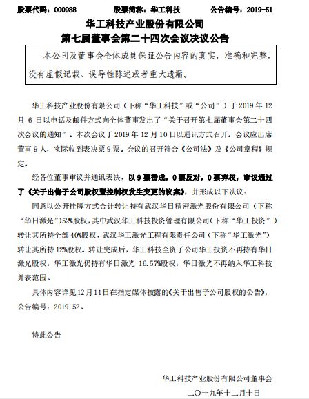 12月10日,华工科技公布,公司全资子公司武汉华工科技投资管理有限公司(“华工投资”)持有武汉华日精密激光股份有限公司(“华日激光”)40%股权,全资子公司武汉华工激光工程有限责任公司(“华工激光”)持有华日激光28.57%股权,公司通过全资子公司华工投资、华工激光合计间接持有华日激光68.57%股权。