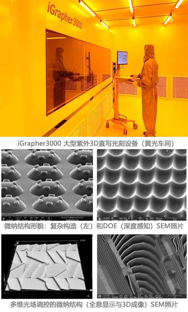 从集成电路图形的平面光刻,迈向光电子的“微结构形貌”的3D光刻,iGrapher3000为新颖材料和功能光电子器件提供了先进手段,下图为iGrapher3000紫外3D光刻装备(110吋幅面,2500mmx1500mm)照片和微纳结构形貌SEM照片。