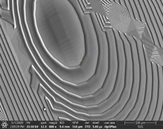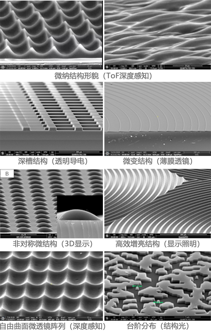 本次投入运行iGrapher3000,“3D形貌“光刻属于厚胶工艺,主要用于光电子材料和器件的制备,作用是将设计数据制备到厚光刻胶基板上,成为具有三维形貌的纳米印版,用于后道压印复制。下图为用于3D显示的微结构形貌SEM照片。
