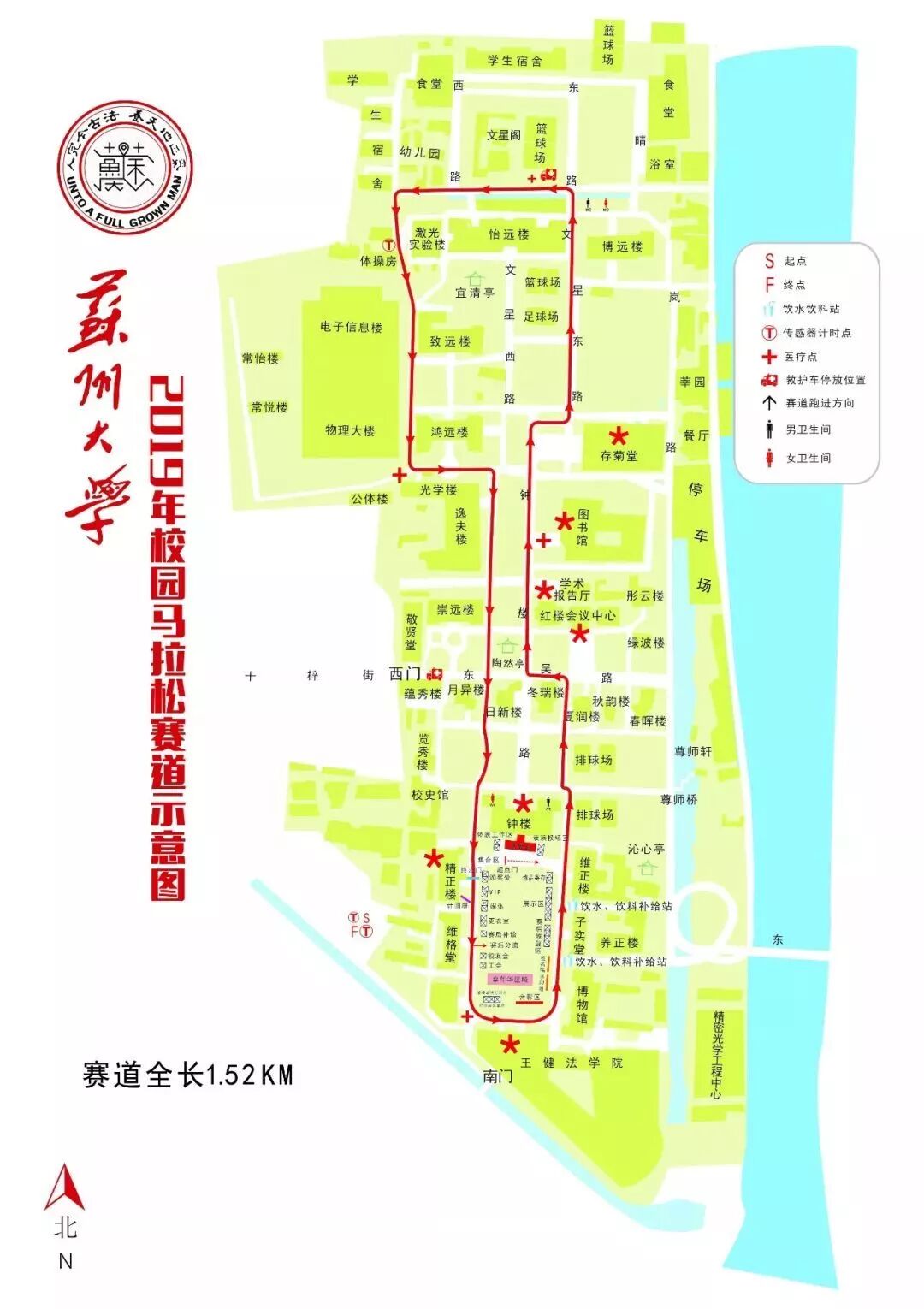 比赛路线:钟楼起跑➙维正堂前道路左拐➙东吴路左拐➙钟楼路右拐➙存菊堂右拐➙文星东路➙文星阁南侧路左拐➙经幼儿园后左拐➙经鸿远楼与光学楼之间道路左拐➙钟楼路西侧道路右拐➙直行穿越东吴路➙直行经维格堂(此处终点,至此为一圈)至法学院北侧道路左拐➙至博物馆左拐直行,之后沿原路线绕圈跑进。