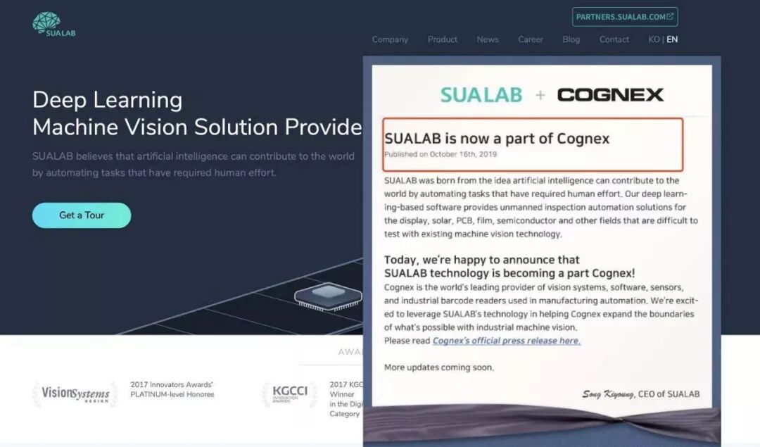 2019年10月16日,康耐视公司(NASDAQ:CGNX)正式宣布收购数优(SUALAB)。尽管收购协议处于保密中,但据相关媒体报道,此次收购价约为1.686亿美元(约合12亿元人民币)。
