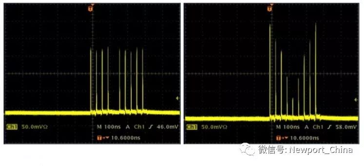在脉冲串模式操作状态下,每个脉冲可以分裂为几个脉冲,并且可以对脉冲串包络整形。例如,可以对脉冲串包络中每个脉冲的幅度进行调整。图2a 中显示了 Spirit 1030-100 激光器产生的短脉冲,其中,第 5 个脉冲的幅度设置为 0%,图 2b 则显示了脉冲整形的一个例子。