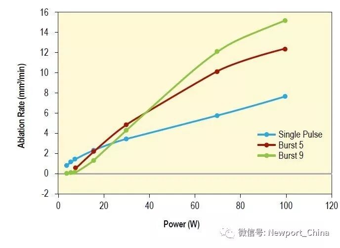 为了研究脉冲串模式功能的效果,我们针对 Spirit 1030-100 系列激光器一定范围的脉冲串输出,对超硬材料多晶金刚石(PCD)烧蚀速率和烧蚀效率进行表征。实验由 PCD 的型腔铣削体积区域组成,测量型腔铣削深度并且确定体积消融率和效率。变量包括了脉冲串包络中脉冲的数量以及平均功率(平均脉冲能量)。重复率固定为 1 MHz,光斑尺寸和扫描速度保持恒定,脉冲之间的重叠率设定为 50%。图 3 显示体积烧蚀率对单脉冲、5 个脉冲串和 9 个脉冲串的平均功率的依赖性。该图表明,在功率不断增加的情况下,采用脉冲串模式会使得烧蚀速率提高,这是维持最佳能量密度所必需的。在平均功率为 100 W 的情况下,我们可以观察到 9 个脉冲串的烧蚀速率增加量是单脉冲的烧蚀速率增加量的 2 倍。针对平均功率进行归一化,图 4 显示了单脉冲、5 脉冲串和 9 脉冲串模式下烧蚀效率和平均功率的关系曲线。可以看出,通过增加脉冲串包络中脉冲的数量来获取高平均功率下的最佳烧蚀速率。测试的结果验证了脉冲串在提高材料去除率方面的优势。