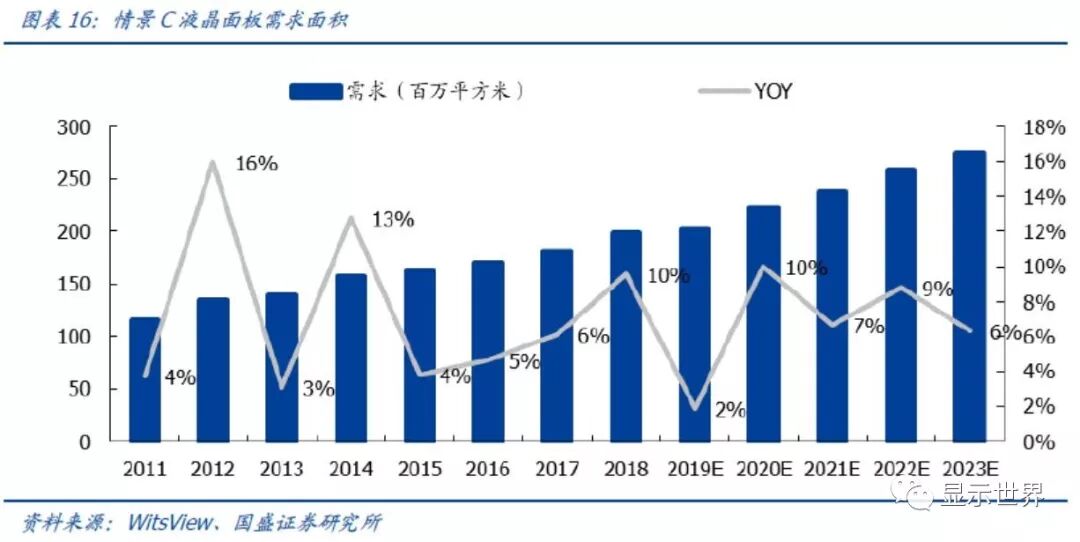 近几年TV面板平均尺寸每年大概增加1寸,按此线性外推未来每年面板面积需求增速约5~8%。根据测算,2018年电视面板平均尺寸为44.8寸,我们预计2019年平均尺寸达到45.7。并且,按照历史经验,预计2019~2023年年平均尺寸增加1寸。在这种假设条件下(需求情景A),我们测算未来面板面积需求增速保持5~8%。