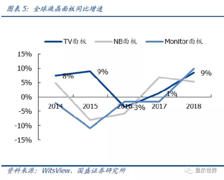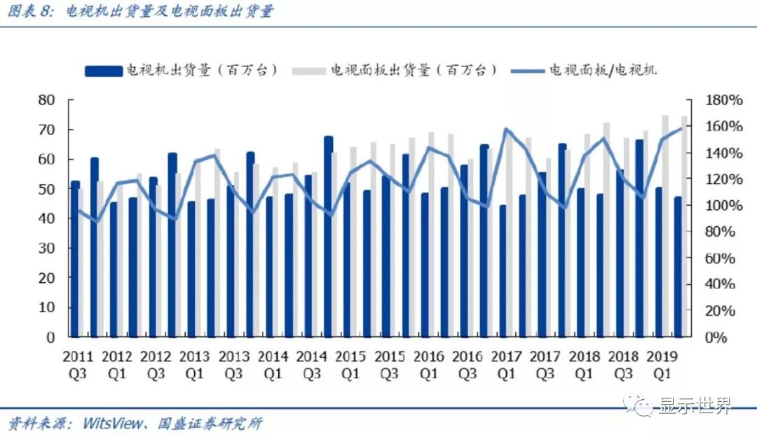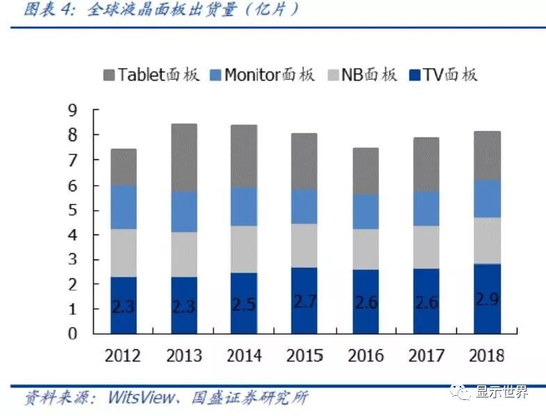 电视消耗八成LCD产能,是需求的主力品类。几大主要主流显示应用出货量并不会显著增长,关键变化在于电视面板平均尺寸。大尺寸面板行业下游应用较广,主要包括电脑、PC、NB、平板等。根据Witsview数据,2018年,全球大尺寸面板出货面积1.99亿平米,其中电视面板1.59亿平米,占比80%,其余分别为笔电0.11亿平米,显示器0.23亿平米,平板0.05亿平米。