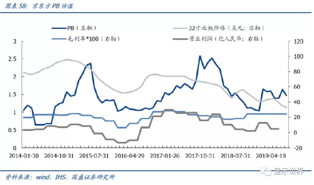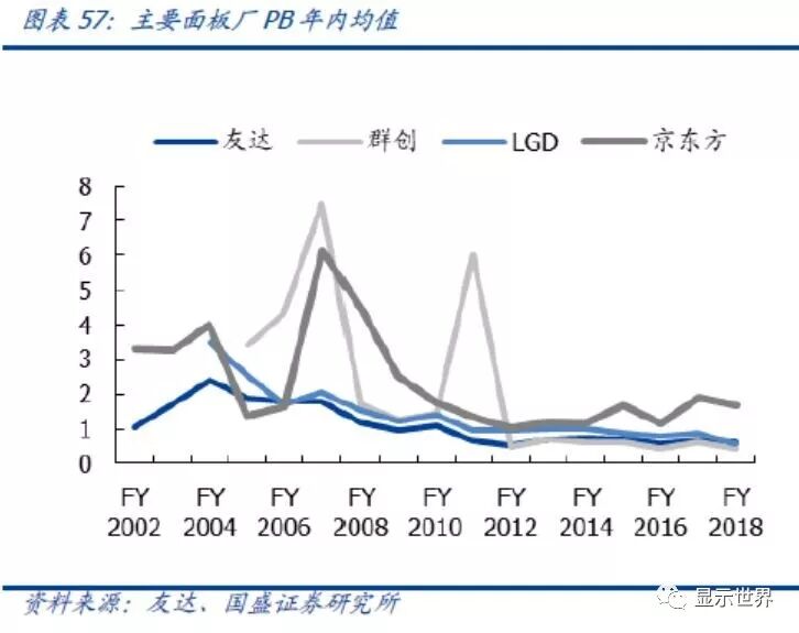 从长周期角度看,台湾面板企业进入成熟阶段,大陆企业尚属成长期,市场赋予不同PB估值。对于海外面板公司,2008~2009年是一个拐点,在此之前,友达、群创、LGD的收入呈现上升趋势,PB估值维持在1.7及以上,在经历了经济危机后,收入与投资均开始停滞,2012年以来,友达、群创PB均值维持在0.4~0.8之间;LGD基本在0.8~1.0之间。京东方的收入从2010年以后持续往上走,PB均值在1~2之间。