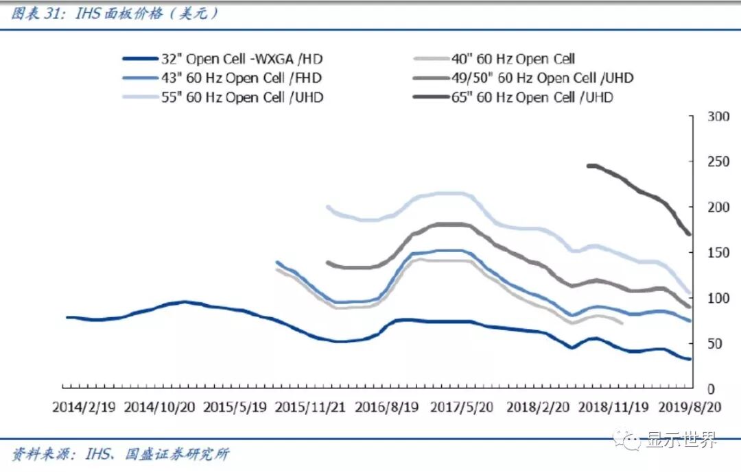 面板价格持续疲弱,多尺寸均创新低。根据IHS数据,从2019年8月跟踪的近期面板价格数据,32寸面板价格为33美元(环比-2美元);43寸面板价格为75美元(环比-4美元);50寸面板价格为90美元(环比-7美元);55寸面板价格106美元(环比-10美元);65寸面板价格170美元(环比-10美元)。