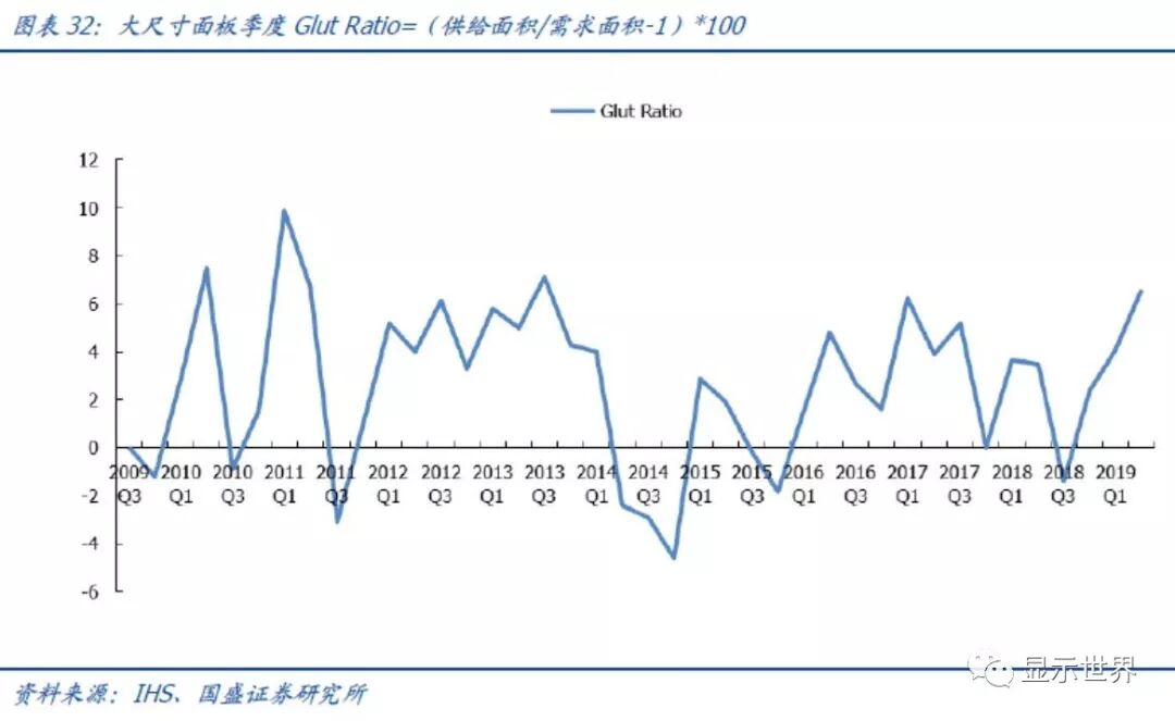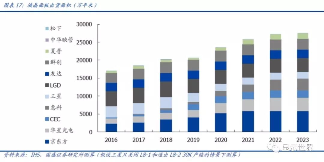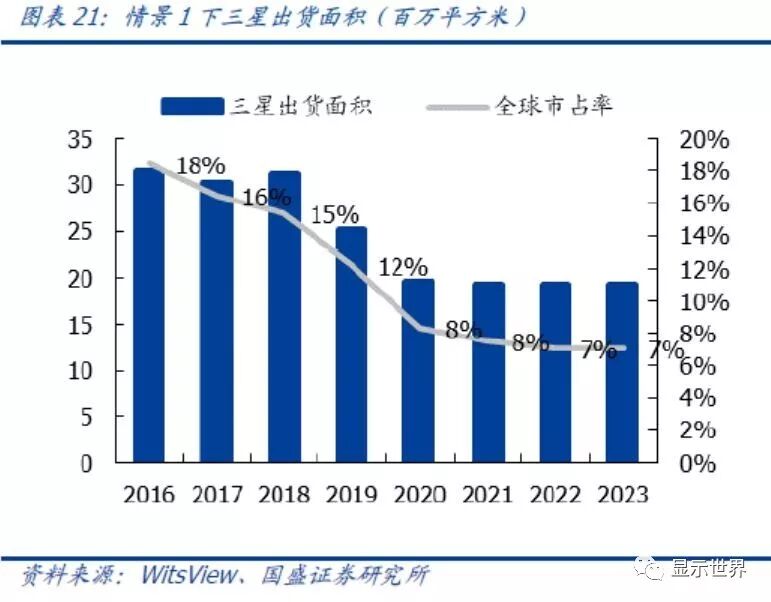 如果参照IHS估计,2018年三星电视面板出货约3800~3900万片,关闭L8-1后将减少1000万片,也大约是25%。根据Witsview数据,三星在2018年出货面积约3028万平米,占全球大尺寸(TV、PC、平板)出货面积的15%。我们预计L8-1退出及L8-2-1关闭30K产能,三星出货面积预计将大约降低25%。换而言之,三星退出的产能占全球LCD供给面积约3.5~4.0%。