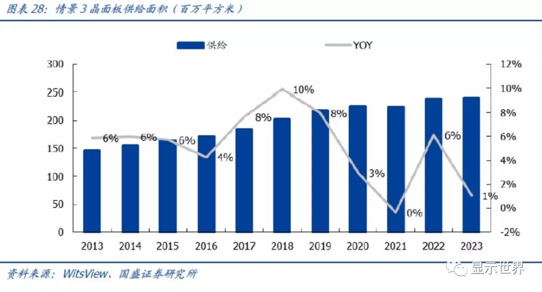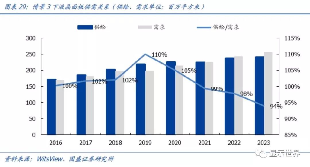 在这种假设下,全球液晶面积供给在2019~2021年保持增速相比情景1有所降低,2022年及以后供给增速迅速降低。我们预期广州的10.5代线和惠科的10.5代线实质上建厂、投产并不能如期进行,供给的增长也就集中于19~21年,行业内后续也没有进一步的LCD投资计划。在这种情景下,LCD在2020~2021年基本供需平衡(供给/需求在110%附近),在2022~2023年进入供不应求(供给/需求<110%)阶段。