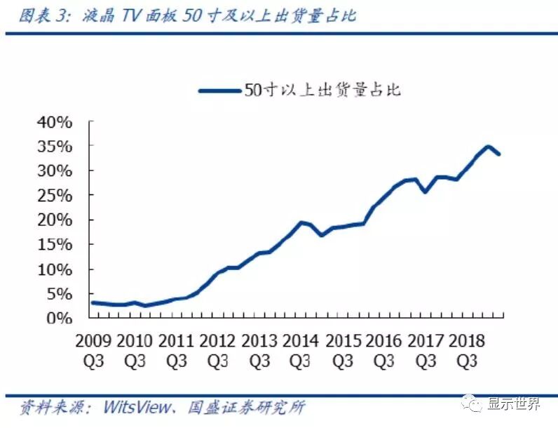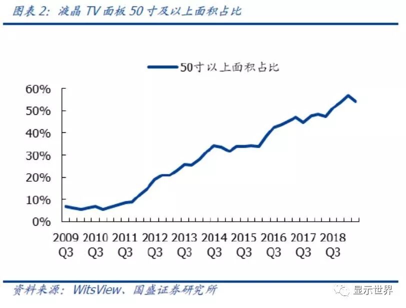 平均尺寸逻辑的验证:2018Q3以来面板平均尺寸重进上升通道。参照witsview最新披露的数据,平均尺寸在2018Q3重新进入明显上升通道。价格下降是平均尺寸提升的重要原因,一方面,这是现有产能的由于32寸及43寸面板价格达历史新低,已经比较接近面板厂商的现金成本,面板厂供给也相应进行调整,增加55寸及以上的产能;另一方面,10.5代线在切65寸及以上的大面板拥有较高经济效益,京东方B9和华星光电T6在2018年的释放对于大尺寸供给有较大影响。目前,50寸以上的液晶TV面板占全部TV面板出货面积比重达到了51%,大尺寸面板渗透率明显提高。