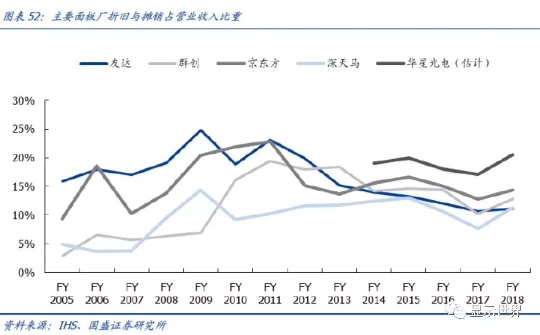 大陆厂商折旧比重还有下降空间。从折旧与摊销占营业收入比重进行分析,2014年以后,基本是顺序为华星光电(国盛预估)>京东方>友达及群创。华星光电折旧期为7年;京东方折旧期为10年;台湾企业主要产线折旧已经结束。以2014~2016年数据作为参考(2017年面板价格影响过大),台湾企业折旧与摊销的比重约13~15%,京东方15~17%,我们预估华星光电17~20%。展望未来,一方面华星光电和京东方分别在2019年、2021年开始退出8.5代线的折旧;另一方面两者还在积极进行大规模资本开支,新产线效率高(部分反映在经济切割下,折旧/营收比重下降),因此我们预估未来大陆厂商该比重将下降。
