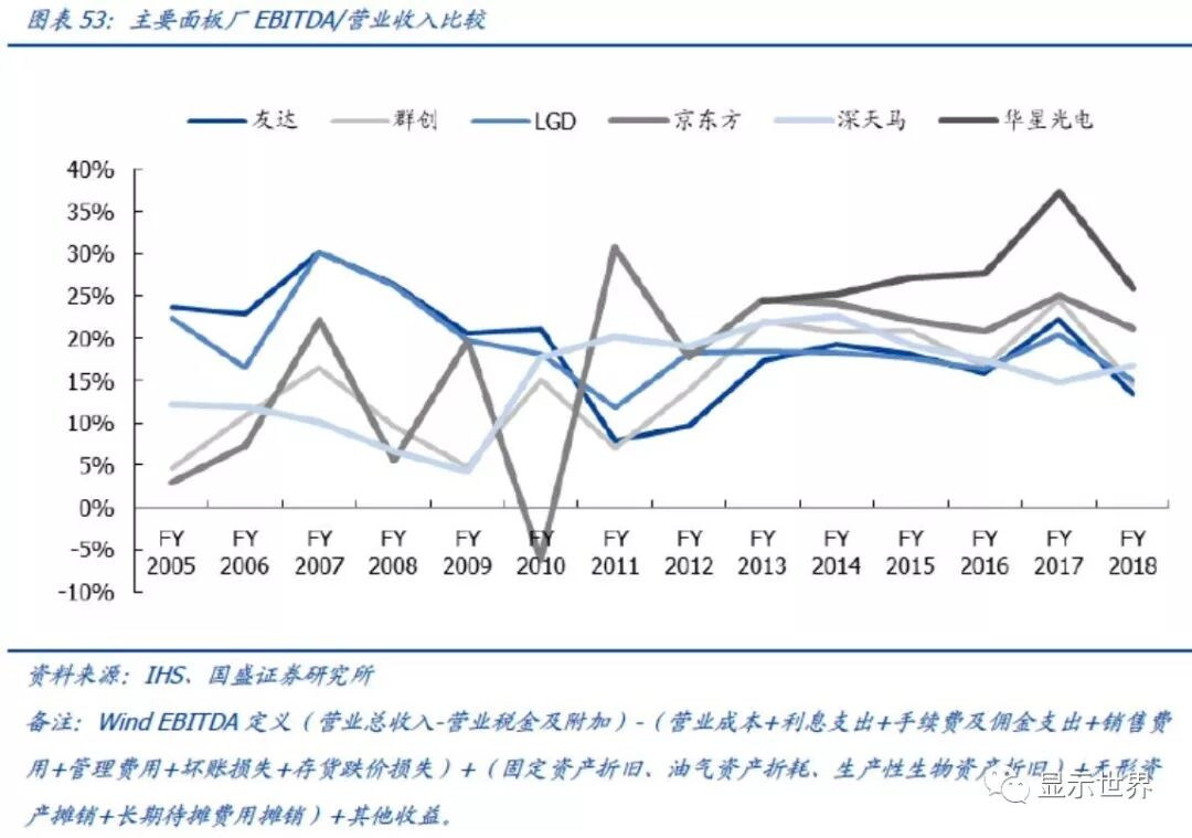 大陆面板厂EBITDA表现优于海外同行。考察2014年以后的EBITDA表现,京东方比友达、群创优势缩小到3~4个百分点;华星光电比友达、群创优势扩大到8~10个百分点。2017、2018年京东方其他收益分别占营业收入0.78%、2.06%。相比于毛利率,不考虑折旧、利息和所得税的EBITDA更能反映面板厂经营能力,大陆面板尺寸的经营能力仍超过海外同行。