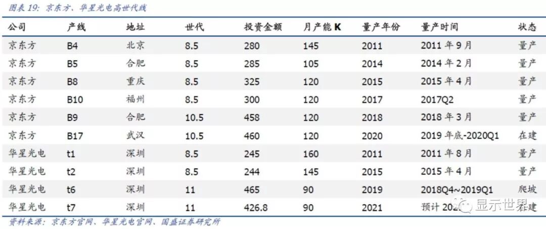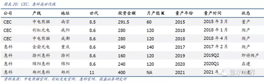 CEC产线目前为止爬产较为顺利,出货面积增长明显。中电熊猫在南京已经运营了一条6代线(90K/月)和一条8.5代线(60K/月),2018年出货面积657万平米;且2018年新开的彩虹光电也达188万平米。2019H1,CEC的出货面积环比、同比均有明显增长。如果预计未来咸阳和成都的产线爬产按现有趋势,产能保持顺利开出,那么其市占率在2020年将达到8%。
