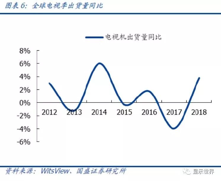 电视出货量2019年较为疲弱,2020年将重返高增长。根据witsview数据,2018年全球大尺寸液晶面板出货量为TV面板2.86亿片(YoY +8.5%)、Monitor面板1.51亿片(YoY +9.9%)、NB面板1.87亿片(YoY +5.4%)、Tablet面板1.84亿片(YoY -10.8%)。液晶TV面板出货量增速呈现周期波动,一般而言增速约1~9%,而TV面板面积增速往往高于出货量增速,其中的差异就源自电视大屏化趋势。受每四年一次的奥运会和每四年一次的世界杯的影响,电视出货量呈现偶数年增长快,奇数年增长较慢。2019年受高基数及全球贸易冲突影响,我们预计出货量是负增长。