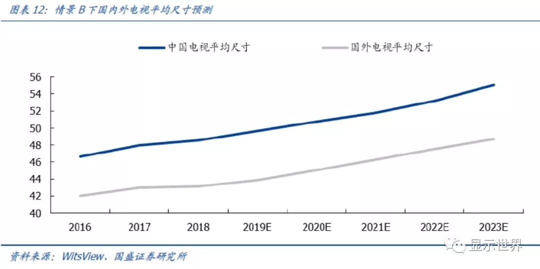 需求情景B:中国超高清计划,国内电视平均尺寸在2023年达到55寸