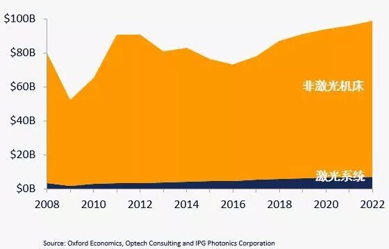 迄今为止,IPG 引领了材料加工市场的两波浪潮:一个是从2010年发展至今的光纤激光打标版块,目前整个设备产值差不多达到15亿到20亿美元,以及从2012年至今的金属钣金加工版块,目前产业链的规模约为100亿美元。