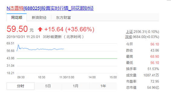 本次「杰普特」共发行人民币普通股2309.2144万股,发行价格43.86元/股,发行市盈率49.02倍,新股募集资金总额10.13亿元,募集资金主要用于激光/光学智能装备扩产建设项目、半导体激光加工及光学检测设备研发生产建设项目等。截止到10月31日,万众瞩目的科创板迎来了四十家挂牌上市公司。杰普特光电公开发行了2309.2144万股新股,占发行后公司总股本的25%,发行后公司总股本为9236.8576万股,今日起上市交易的有2110.0684万股。杰普特光电股票代码为688025,今日开盘价为每股56.1元,较43.86元的发行价上涨12.24元,涨幅为56.1%。