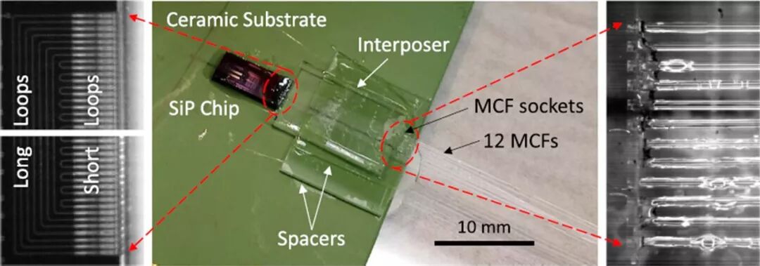 图1.边缘耦合插入器的示意图,提供了紧凑的封装解决方案,用于将12条多芯光纤(MCF)之间的84个通道互连到硅光子(SiP)光学处理芯片。 (a)飞秒(fs)激光将光波导扇形与刻蚀轨迹一起刻入,刻蚀轨迹在化学刻蚀后通向MCF对准插座。 二氧化硅的加法和减法激光加工促进了MCF的亚微米自对准,以有效地与插入波导耦合,(b)大大降低了光纤对准和封装从5轴到单轴(方位)对准的复杂性。