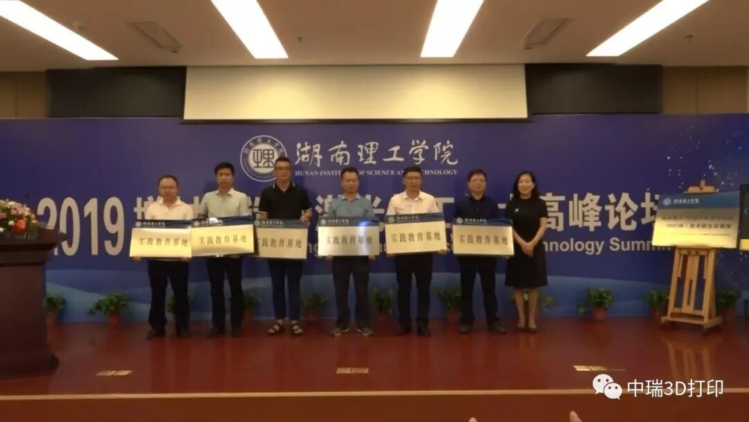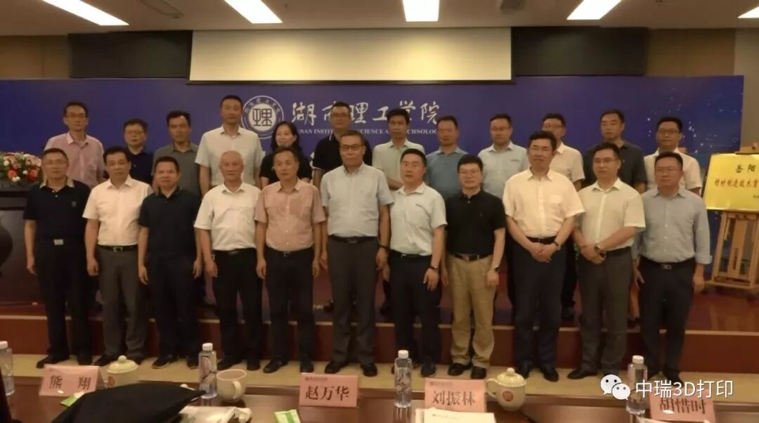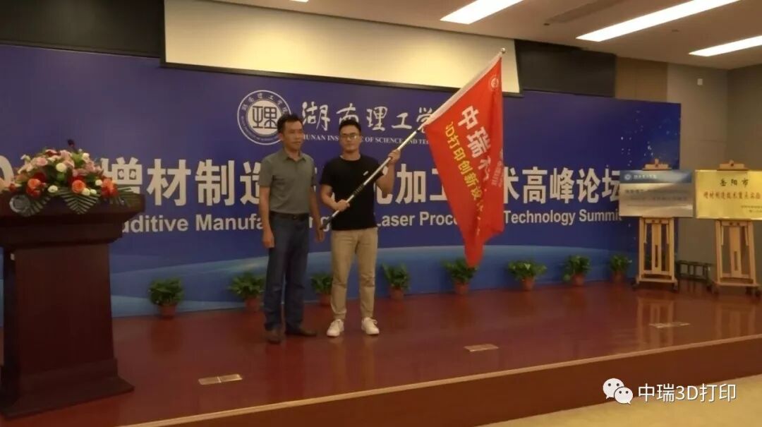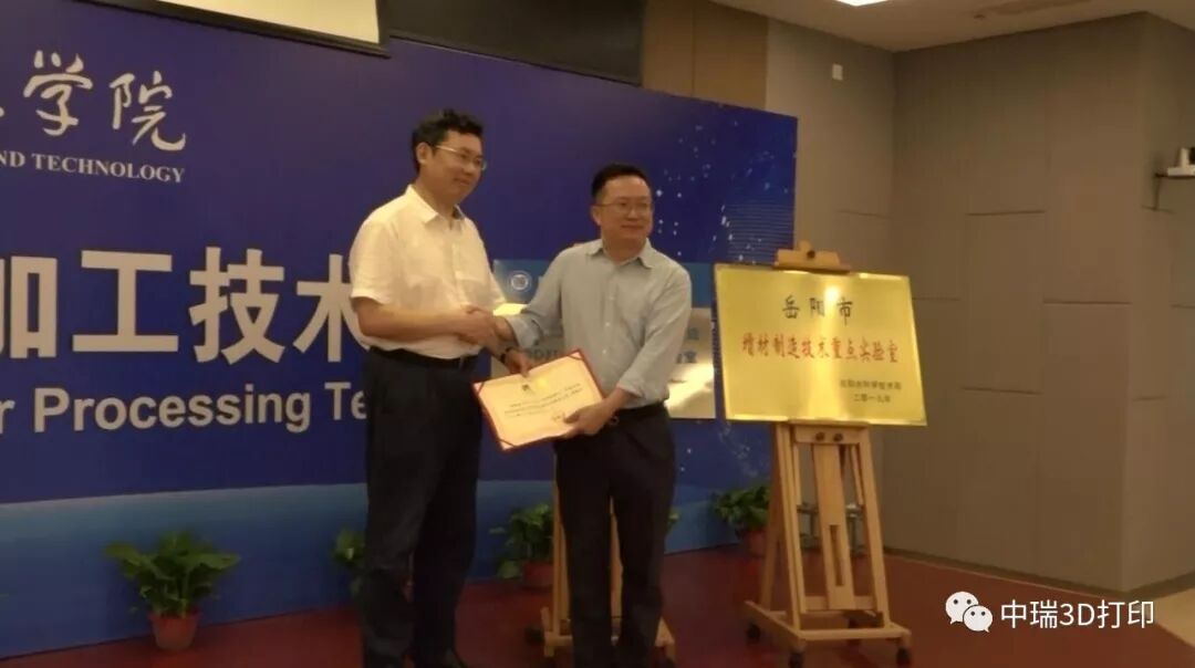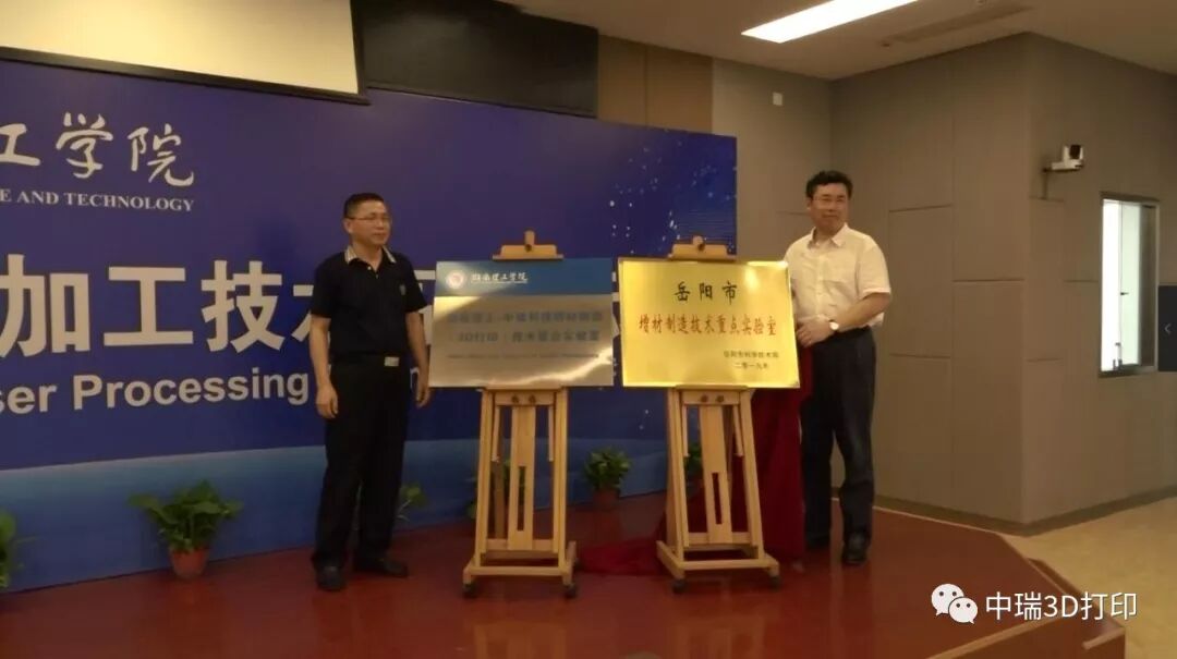 图为湖南理工学院卢先明校长、岳阳市科技局曹合群局长为岳阳市增材制造技术重点实验室、湖南理工-中瑞科技增材制造(3D打印)联合实验室揭牌。