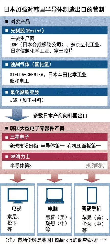日本是这三大原材料的主要生产商,例如氟化氢的市场份额就高达8-9成。而韩国是这些原材料的主要买家。失去了日本这个主要的供货商,韩国很可能找不到其他的替代品。