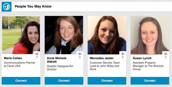 然后,该算法生成与特定模式匹配的人员列表。然后向您推荐这些人,期望您可能想要了解他们(或者至少有与您的非常相似的个人资料)。