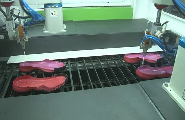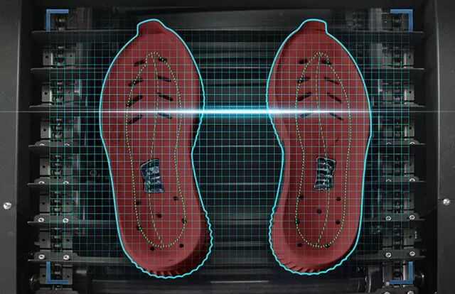 两台5轴机器手协同作业,6~8秒内即能完成鞋底扫描和喷胶工作。