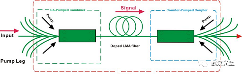 反向泵浦(Counter-pumping): 在激光放大器中,泵浦光与信号光的传输方向相反,顺着信号激光传输方向,泵浦光逐渐增强,信号光也逐渐增强。反向泵浦方式对合束器的性能要求较高,一是对信号光插入损耗要求较高(低于<0.3dB),二是对泵浦臂耐受反向包层光的要求较高(10%左右的泵浦光)。反向泵浦时,同等功率条件下,激光的ASE噪声和非线性强度要远低于正向泵浦。