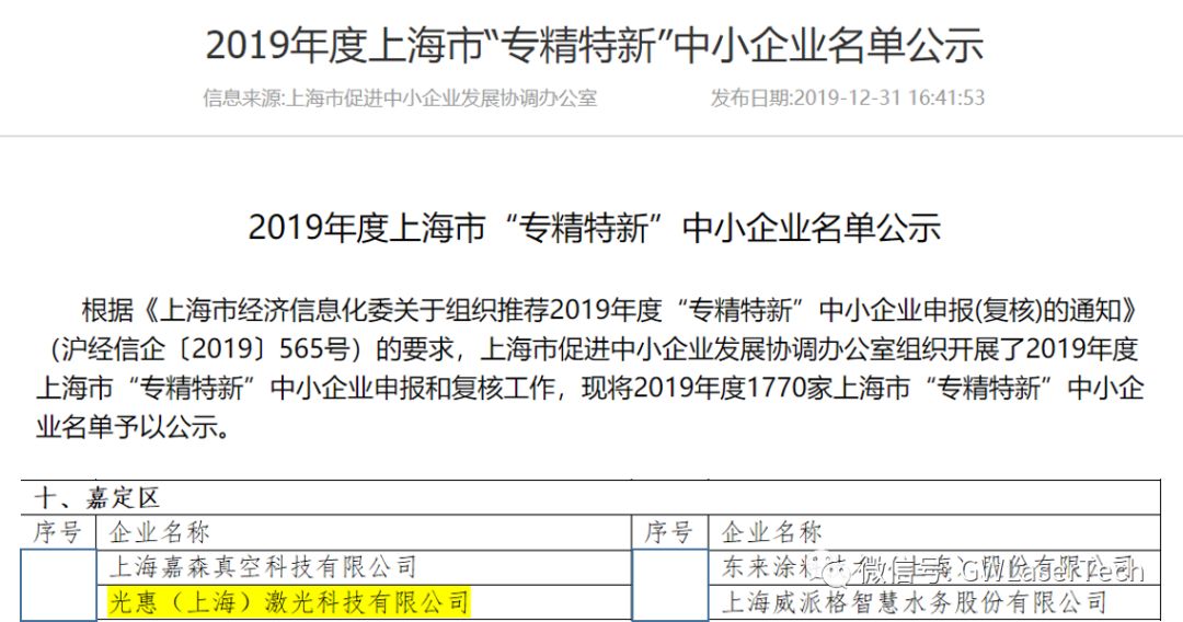 日前,《2019年度上海市“专精特新”企业公示名单》发布,GW LASER TECH榜上有名。