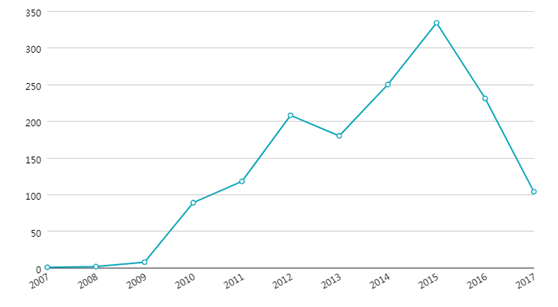 2009年至2015年间,中国石墨烯相关技术的海外申请数量从不足十件增长到近350件,一直保持快速增长态势。这与国际和国内石墨烯产业的发展脉络基本相同。2010年石墨烯获得诺贝尔物理学奖,此后各国纷纷布局石墨烯研发与创新。特别是中国,大致自2013年后从政府政策支持到企业创新发展水平,一直处在世界石墨烯技术研发特别是应用技术开发的潮头。2016后,中国更是毋庸置疑的成为全世界石墨烯技术发展的热土。由于专利数据公开的滞后性,2016年与2017年的数据仅供参考。但是基本上可以推测,中国石墨烯技术的海外申请量还会随着这样的热度持续快速增长下去。