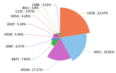 如上排名可以看出,C01B(非金属元素;其化合物)是中国石墨烯海外专利布局最多的技术领域,其中包含石墨烯及其氧化物的制备、石墨烯复合材料等。B82Y(纳米结构的特定用途或应用)主要是基于石墨烯制作复合材料。G06F(电数字数据处理)主要是石墨烯在触控基板、压力感测、指纹识别、指尖套领域的应用。G02F(用于控制光的强度、颜色、相位、偏振或方向的器件或装置)相关专利多为石墨烯在液晶透镜、集成传感器、透明导电膜、tft等方面的应用。C23C(对金属材料的镀覆)、B01J(化学或物理方法)、C08K(使用无机物或非高分子有机物作为配料)也均是石墨烯的重要应用领域。