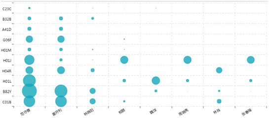 可以看出杨久霞在京东方科技集团股份有限公司中技术优势突出,在2013到2016年间共申请专利15项,其技术方向主要布局在H01L(半导体器件)、G02F(用于控制光的强度、颜色、相位、偏振或方向的器件或装置)、G06F(电数字数据处理)领域。白峰的海外专利申请数量也较多,张峰、姚琪、戴天明、董学等人也有较强的研发能力。