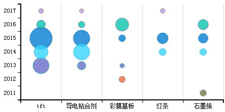由图可见,深圳市华星光电技术有限公司海外申请的石墨烯相关专利技术主要分布在tft基板结构、导电粘合剂、彩膜基板、LED灯条、石墨烯用于液晶显示面板等方向。这几个主要技术领域的石墨烯海外专利均有持续增长的申请趋势。