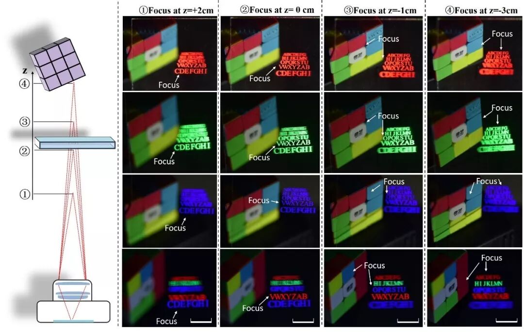 为了提高3D显示体验效果,研究团队设计并制备了紧密连续取样视点的metagrating像素结构,再现连续3D光场的波前信息,重现了单色和彩色的3D光场信息。利用相机模拟单个眼睛调焦过程时发现,投影在不同深度的彩色字母与真实物体的深度信息一致,攻克了以往3D显示中的辐辏调节矛盾这一国际难题。