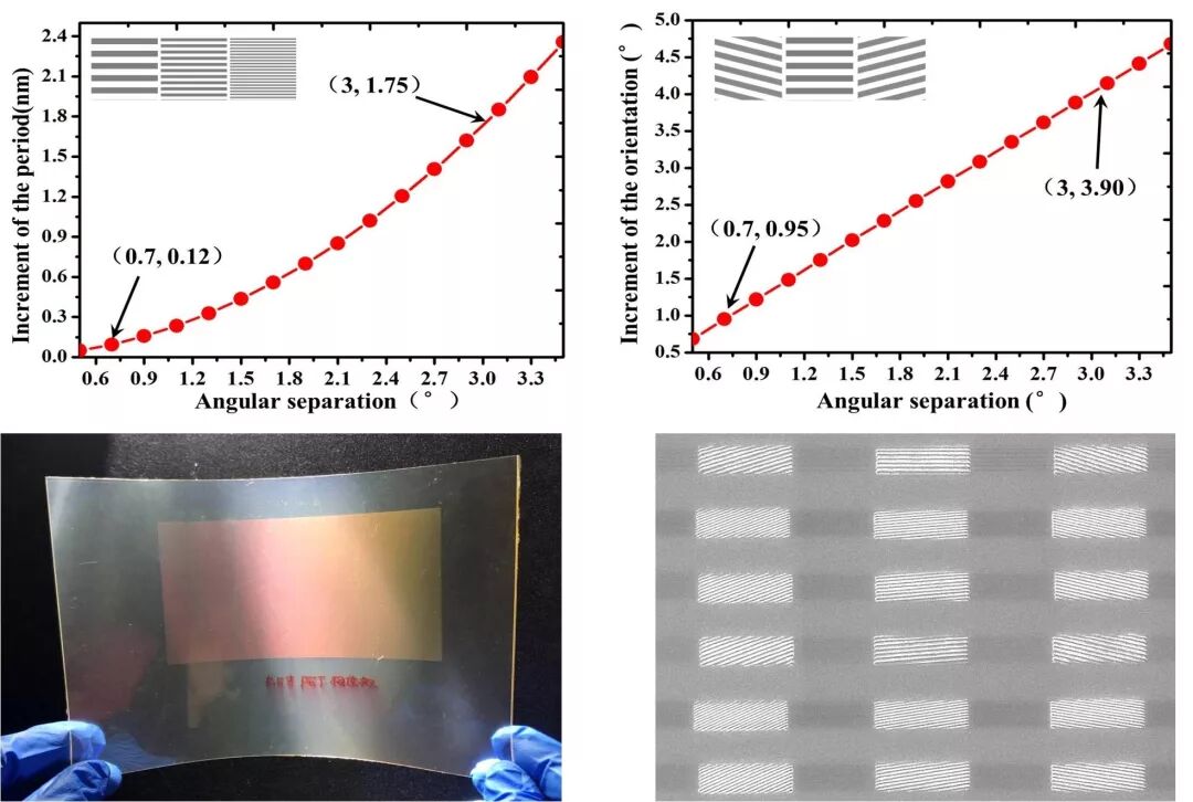 团队理论计算了会聚视点再现角间隔与像素化metagrating周期和取向变化的关系。像素内结构变化精度达到亚纳米级才能形成会聚视点。例如,为获得0.7°的视角间隔,metagrating周期调控精度需达到0.12nm。为了攻克亚纳米精度metagrating的制备难题,研究团队自主研制了紫外连续变频纳米光刻系统,制备了含不同metagrating结构参数的视角调制板。