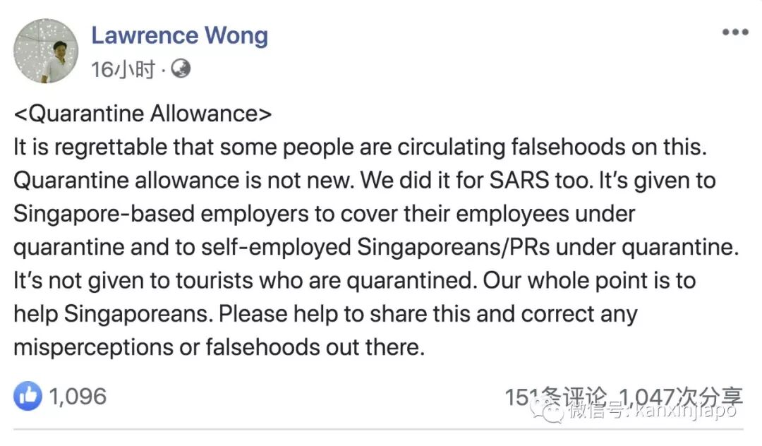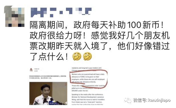 有不少网友误认为只要是被隔离在家的工作人士,都可以获得这每天100新币的补贴。另一些人则以为这是新加坡政府第一次给被隔离人士发隔离补贴。其实不然。国家发展部长兼财政部第二部长黄循财发文澄清,隔离补贴并不新鲜,在2003年SARS期间,新加坡就曾实施这一政策。他也说,本次隔离补贴只是给以新加坡为基地的雇主,以及身为新加坡公民与永久居民的自雇人士。被隔离的旅客不会得到补贴。什么叫“以新加坡为基地的雇主”?简单说,就是在新加坡的雇主——不管你是新加坡资、中资、美资、日资、韩资,只要你有员工被强制隔离了,政府就会给你每天100新币的补助,来弥补雇主的损失。因为强制隔离的这些天员工是带薪休假,并不计入年假。也就是说,员工的年假不变,多出来的这14天在家隔离无法工作,但雇主薪水照发。打个比方,假定被强制隔离的员工月薪5000新币,被隔离14天无法上班,雇主仍要支付员工全薪,这么一来,雇主的损失约2500新币。所以,这每天100新币的补贴是用来弥补这个损失的,以确保新加坡的中小企业不会因为这个事情被拖垮。如果是新加坡公民或永久居民的自雇人士(例如徳士司机)被强制隔离,这100新币的补助金就会直接给这些人。毕竟如果他们不出去上班,就不会有任何收入,损失惨重。