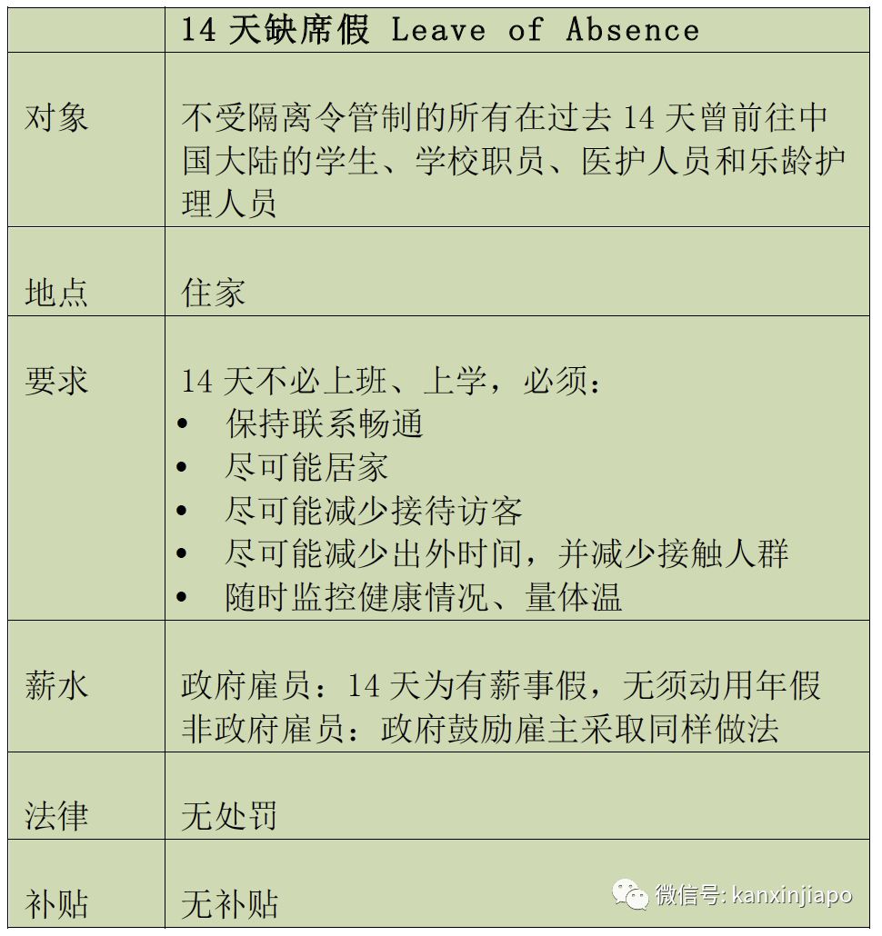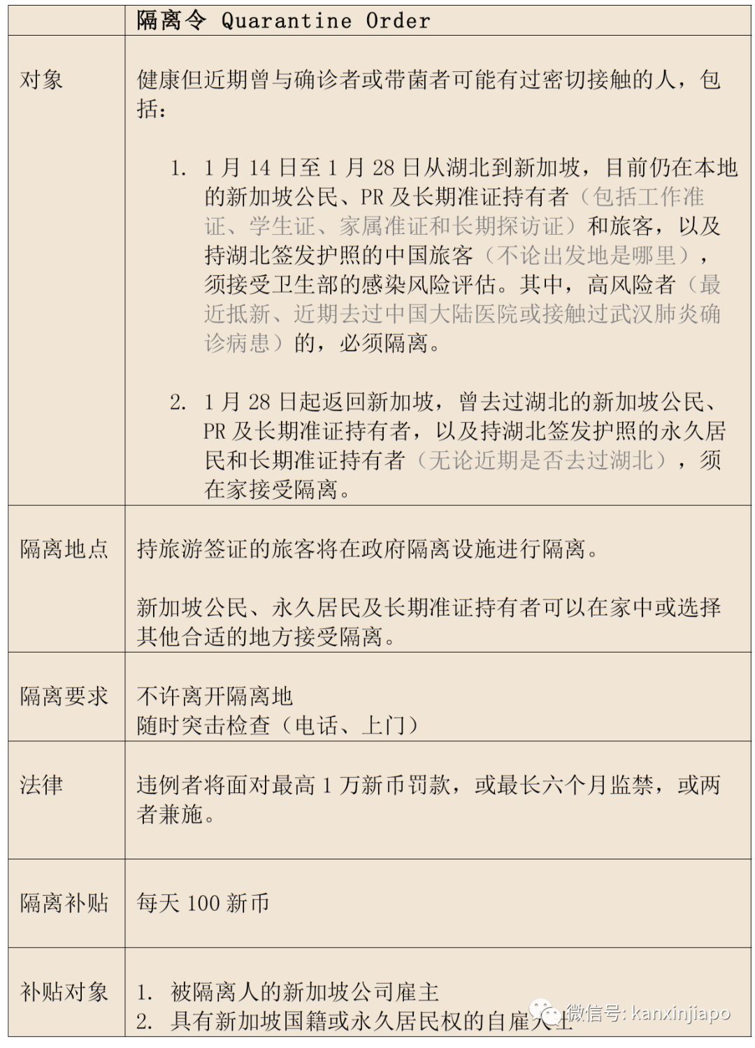 这些人将会收到政府发放的隔离令(Quarantine Order),隔离令具有法律效力,任何违反隔离规定的人将会面临高达10,000新币的罚款、长达6个月的监禁,或两者兼施。值得一提的是,这个隔离令与针对学生、学校职员、医护人员等人的缺席假(Leave of Absence)不同。