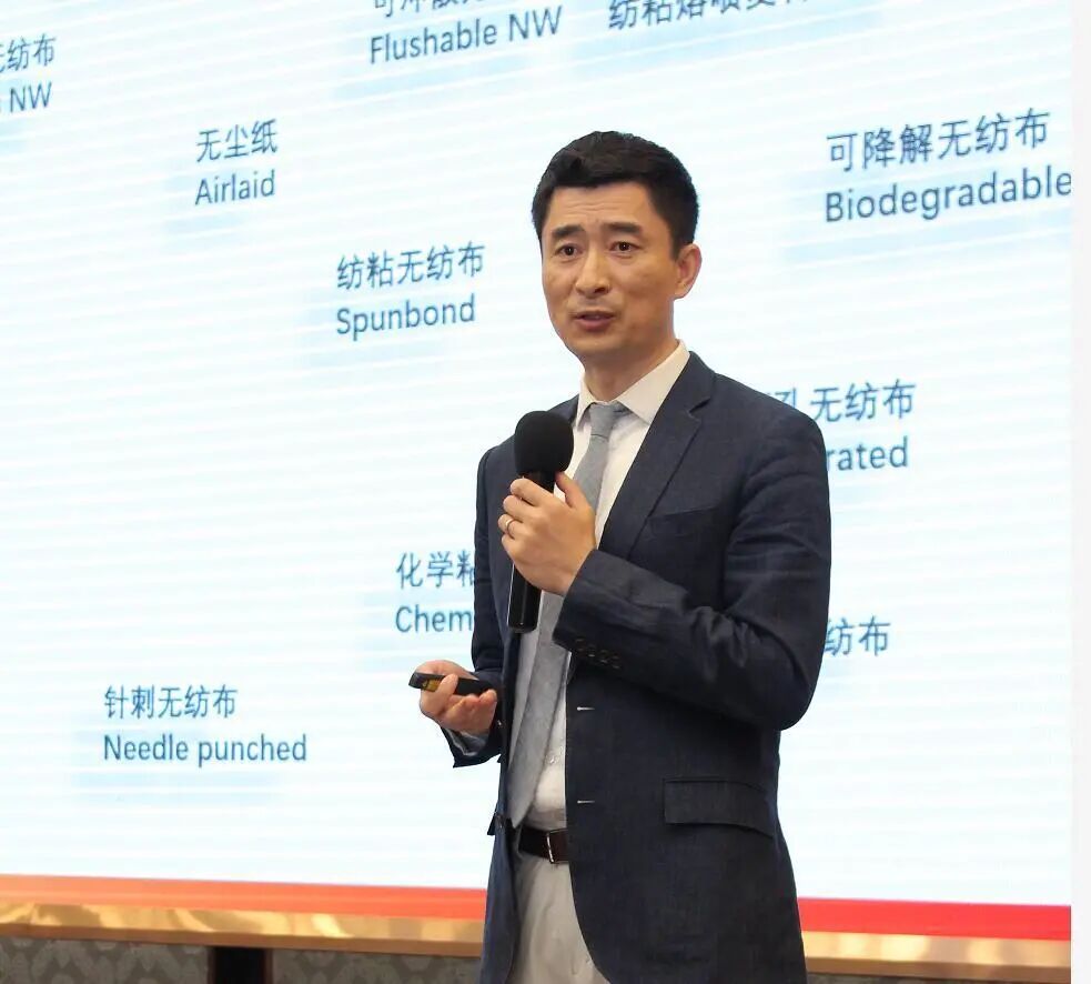 田雨先生还详细介绍了俊富混合无纺布技术的特点和市场前景。这种新型复合无纺布的优势包括:更短的供应链;简单的固网方式,不需要水刺过程的缠结来固网;不需要用水和水处理设备;不需要烘箱烘干网面。他表示,这种混合无纺布技术通过“最经济的材料+最有效的工艺+规模化的生产”来打造更便宜、更好、更绿色的无纺布产品,从而能广泛应用于纸尿裤和卫生巾的吸收芯体、个人护理湿巾、医疗手术铺单、硬表面擦拭布等领域,并且为产业链的格局和产品的整体结构设计带来巨大的想象空间。