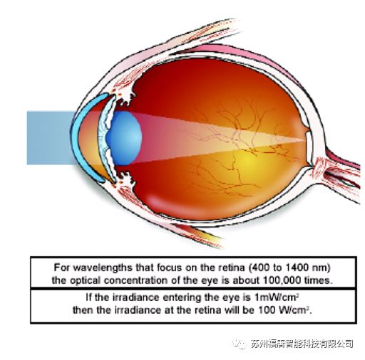 原理见上图:对于视网膜来讲,眼球是一个聚焦镜,由于激光具有亮度高,方向性好等特点,有别于一般的光源,当外界很小功率的激光经过眼球聚焦,聚焦后,能量密度会100000倍数增长,激光危害指数瞬间提高十万倍,可想而知,对视网膜破坏力多恐怖。